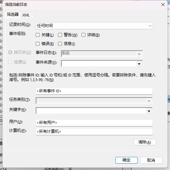 4、在筛选当前日志的窗口,在包括/排除事件ID窗口中,输入6006,6008,然后点击确定,即可显示win系统异常关机重启日志